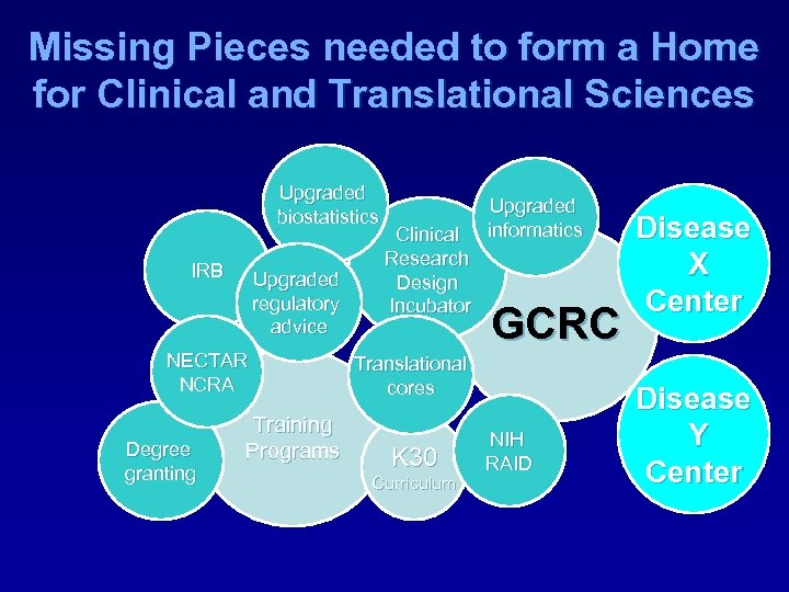 Missing Pieces needed to form a Home for Clinical and Translational Sciences Upgraded biostatistics IRB Upgraded regulatory advice NECTAR NCRA Degree granting Training Programs Clinical Research Design Incubator Upgraded informatics GCRC Translational cores K 30 Curriculum NIH RAID Disease X Center Disease Y Center