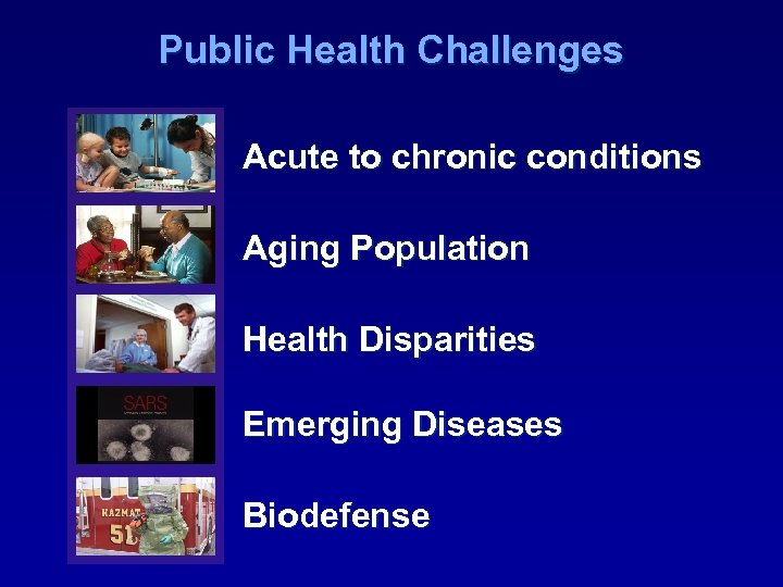 Public Health Challenges Acute to chronic conditions Aging Population Health Disparities Emerging Diseases Biodefense