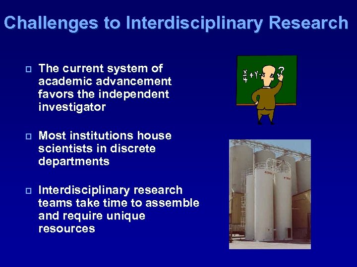 Challenges to Interdisciplinary Research p The current system of academic advancement favors the independent investigator p Most institutions house scientists in discrete departments p Interdisciplinary research teams take time to assemble and require unique resources