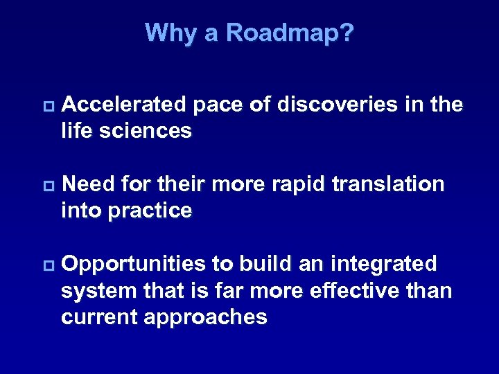 Why a Roadmap? p Accelerated pace of discoveries in the life sciences p Need for their more rapid translation into practice p Opportunities to build an integrated system that is far more effective than current approaches
