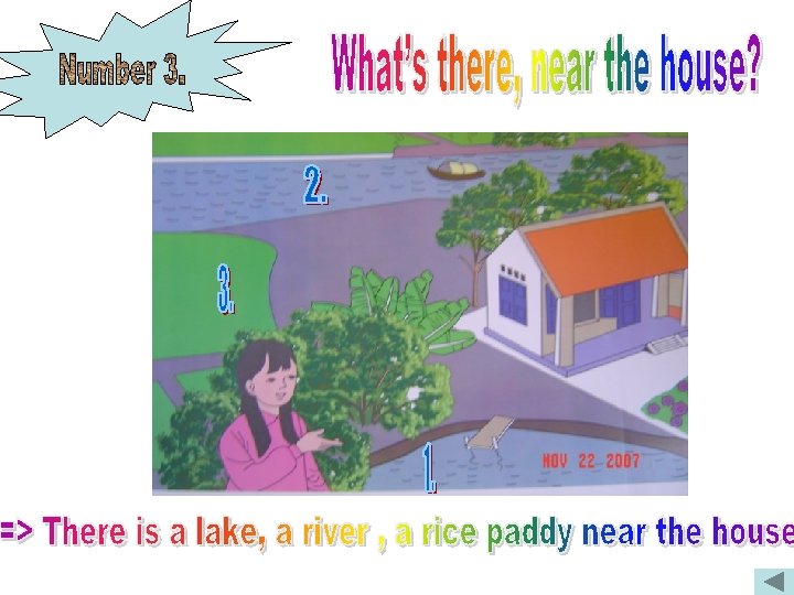 a, Where is the yard ? It’s in front of the house. b, Where are the tall trees ? They are behind the house. c. Where are the mountains ? They are behind the tall trees. d, Where is the well ? It’s to the left of the house. e, Where are the flowers ? f. Where is the house? They are to the right of the house. It’s between the well and the flowers.