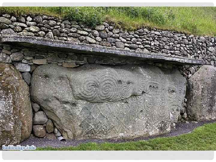 NEW-GRANGE • An outstanding example is the passage grave at New-Grange in Ireland, dating from about 2500 BC. • Huge slabs of stone, carved in intricate spiral patterns, form the walls of the chamber. • At sunrise on the winter solstice (the shortest day of the year, when the sun itself seems in danger of dying) the rays penetrate the length of the passage to illuminate the innermost recess.