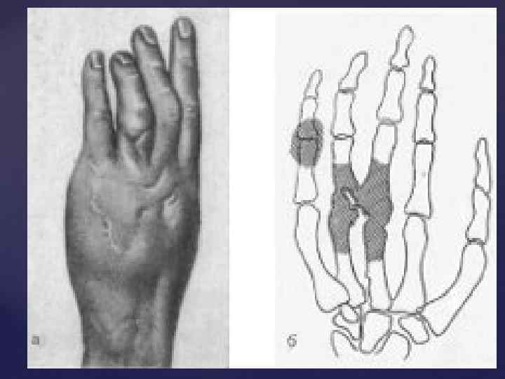 3)Саусақтың бүгілу қалпының тұрақтануы; 4)Саусақтың енжар қимылдатқанда ( әсіресе жазғанда) қатты ауыруы;