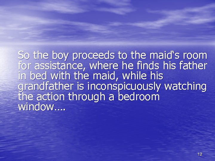 So the boy proceeds to the maid‘s room for assistance, where he finds his father in bed with the maid, while his grandfather is inconspicuously watching the action through a bedroom window…. 12