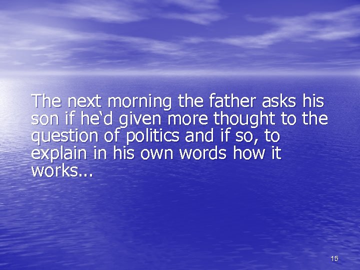 The next morning the father asks his son if he‘d given more thought to the question of politics and if so, to explain in his own words how it works. . . 15