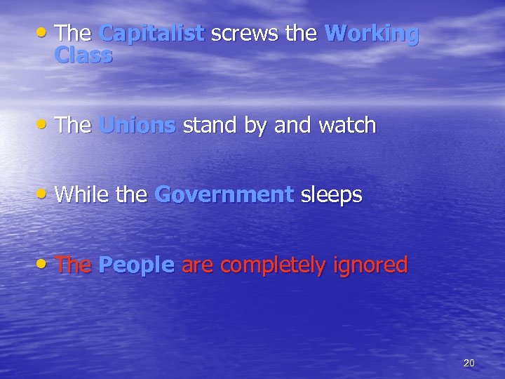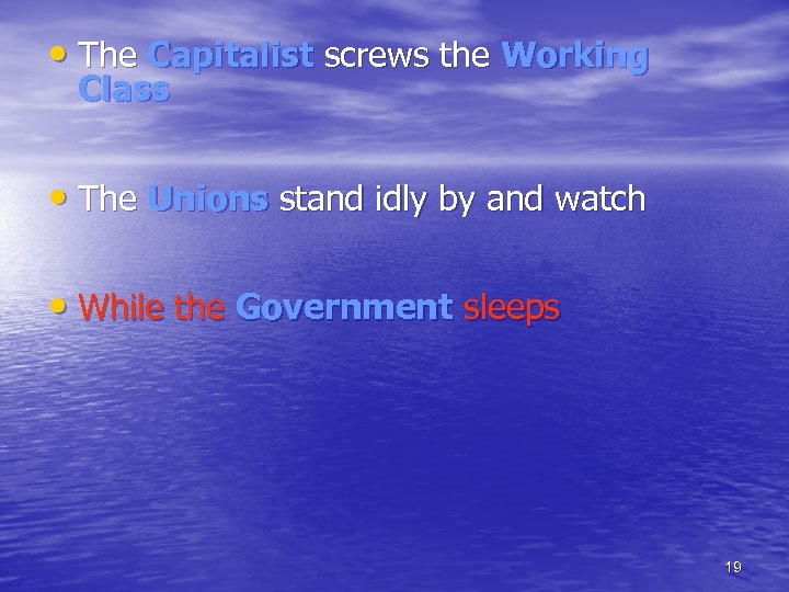 • The Capitalist screws the Working Class • The Unions stand idly by and watch • While the Government sleeps 19