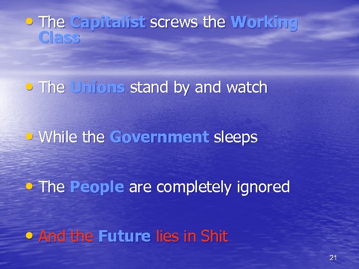 • The Capitalist screws the Working Class • The Unions stand by and watch • While the Government sleeps • The People are completely ignored • And the Future lies in Shit 21