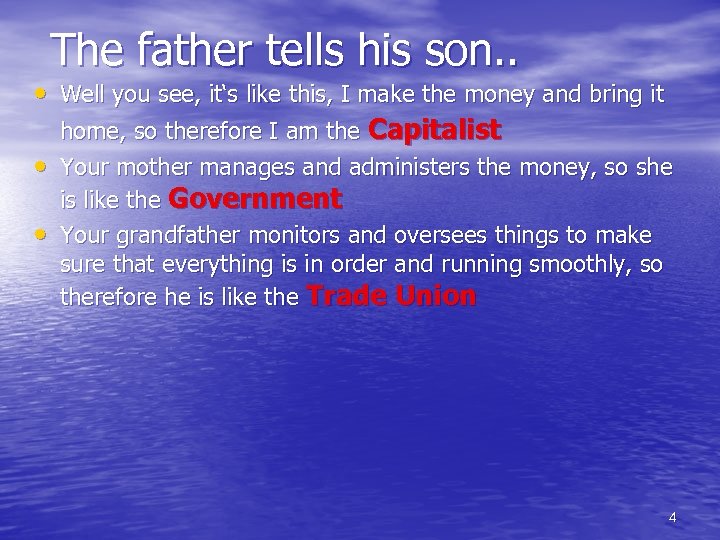 The father tells his son. . • Well you see, it‘s like this, I make the money and bring it home, so therefore I am the Capitalist • Your mother manages and administers the money, so she is like the Government 3
