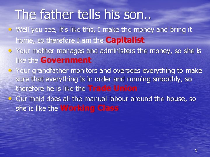 The father tells his son. . • Well you see, it‘s like this, I make the money and bring it home, so therefore I am the Capitalist • Your mother manages and administers the money, so she is like the Government • Your grandfather monitors and oversees things to make sure that everything is in order and running smoothly, so therefore he is like the Trade Union 4