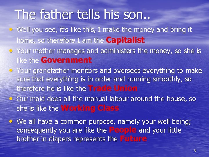 The father tells his son. . • Well you see, it‘s like this, I make the money and bring it home, so therefore I am the Capitalist • Your mother manages and administers the money, so she is like the Government • Your grandfather monitors and oversees everything to make • sure that everything is in order and running smoothly, so therefore he is like the Trade Union Our maid does all the manual labour around the house, so she is like the Working Class 5