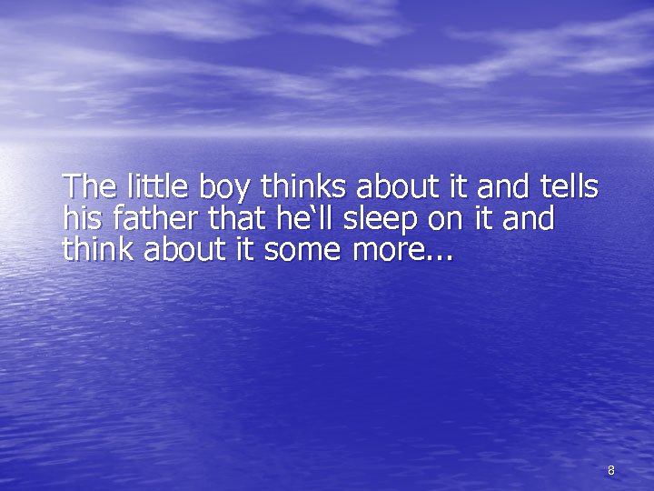 The little boy thinks about it and tells his father that he‘ll sleep on it and think about it some more. . . 8