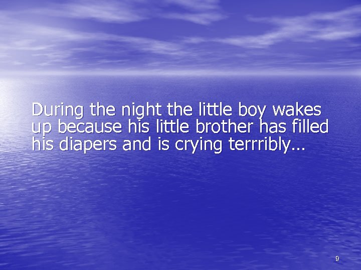 During the night the little boy wakes up because his little brother has filled his diapers and is crying terrribly… 9
