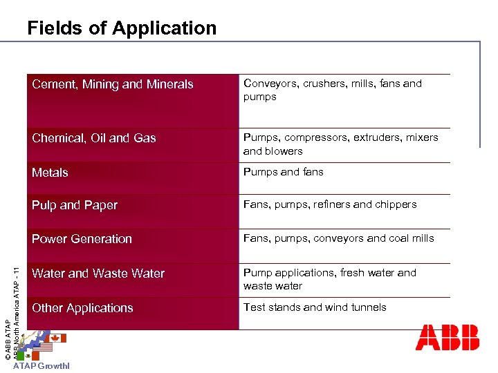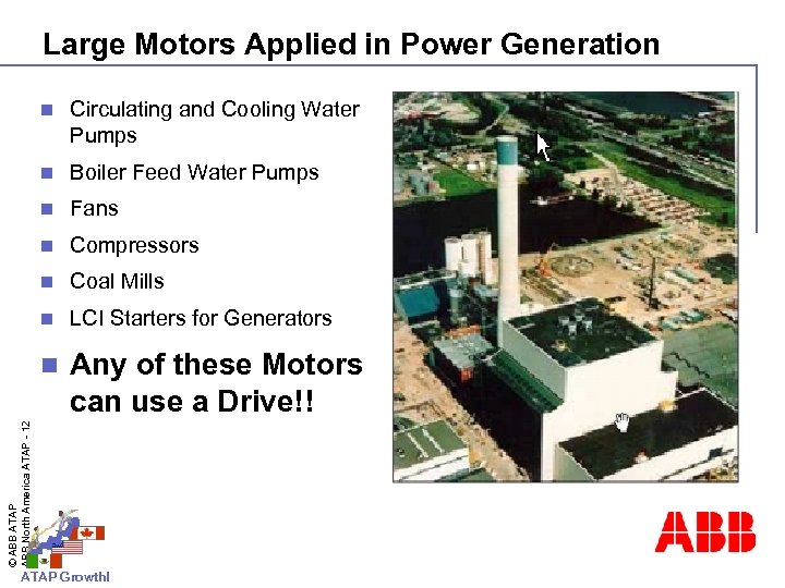 Fields of Application Conveyors, crushers, mills, fans and pumps Chemical, Oil and Gas Pumps, compressors, extruders, mixers and blowers Metals Pumps and fans Pulp and Paper Fans, pumps, refiners and chippers Power Generation © ABB ATAP ABB North America ATAP - 11 Cement, Mining and Minerals Fans, pumps, conveyors and coal mills Water and Waste Water Pump applications, fresh water and waste water Other Applications Test stands and wind tunnels ATAP Growth!