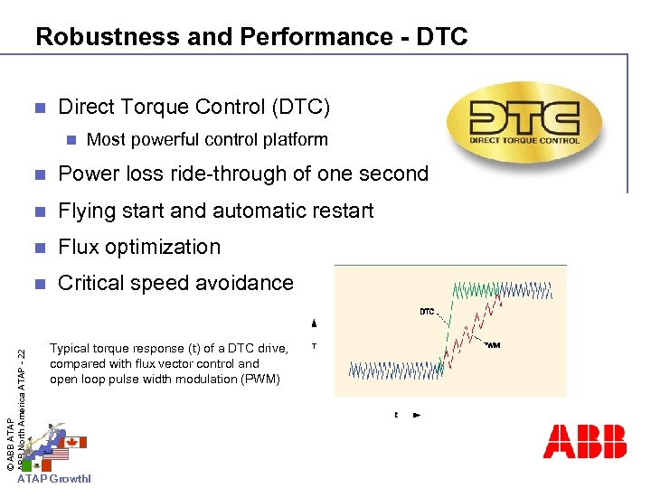 Robustness and Performance - DTC n Direct Torque Control (DTC) n Most powerful control platform Power loss ride-through of one second n Flying start and automatic restart n Flux optimization n © ABB ATAP ABB North America ATAP - 22 n Critical speed avoidance bands Typical torque response (t) of a DTC drive, compared with flux vector control and open loop pulse width modulation (PWM) ATAP Growth!