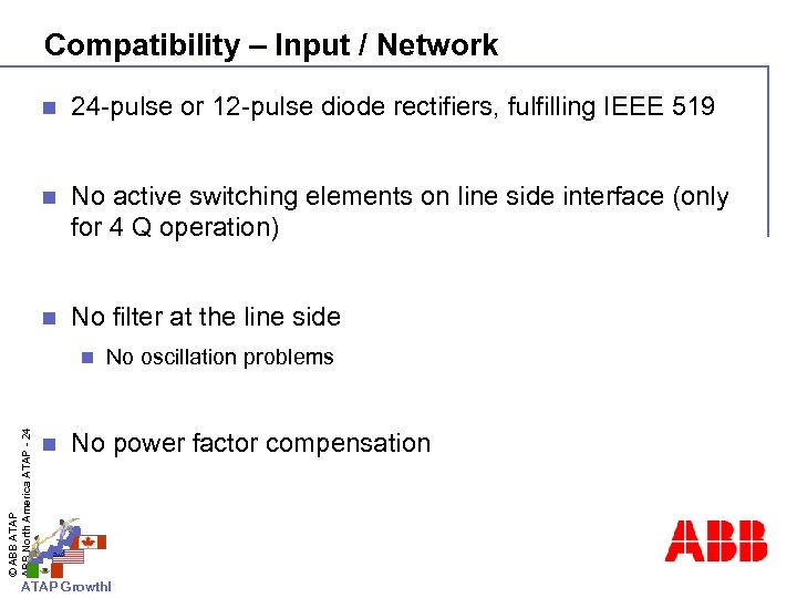 Compatibility – Input / Network n 24 -pulse or 12 -pulse diode rectifiers, fulfilling IEEE 519 n No active switching elements on line side interface (only for 4 Q operation) n No filter at the line side © ABB ATAP ABB North America ATAP - 24 n n No oscillation problems No power factor compensation ATAP Growth!