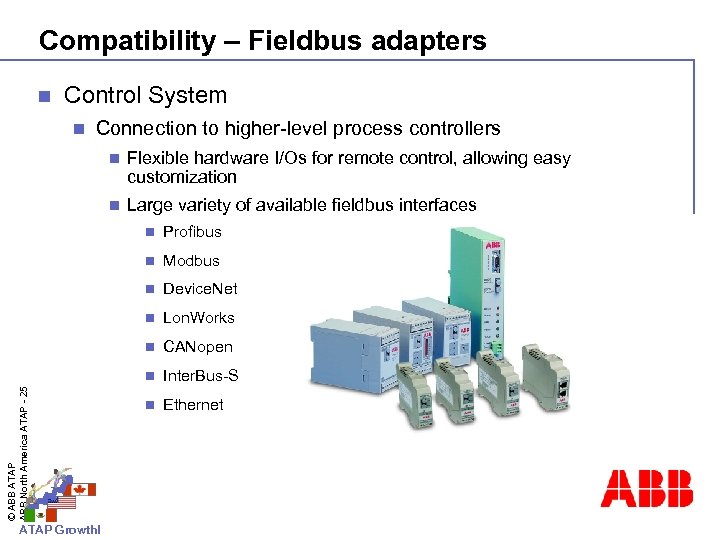 Compatibility – Fieldbus adapters n Control System n Connection to higher-level process controllers n Flexible hardware I/Os for remote control, allowing easy customization n Large variety of available fieldbus interfaces Modbus n Device. Net n Lon. Works n CANopen n ATAP Growth! Profibus n © ABB ATAP ABB North America ATAP - 25 n Inter. Bus-S n Ethernet