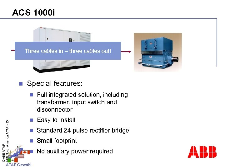ACS 1000 i Three cables in – three cables out! n Special features: © ABB ATAP ABB North America ATAP - 33 n Full integrated solution, including transformer, input switch and disconnector n Easy to install n Standard 24 -pulse rectifier bridge n Small footprint n No auxiliary power required ATAP Growth!