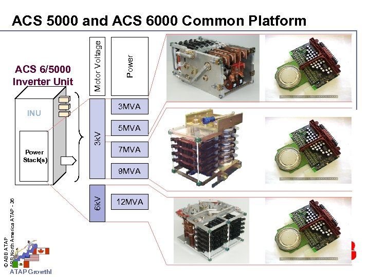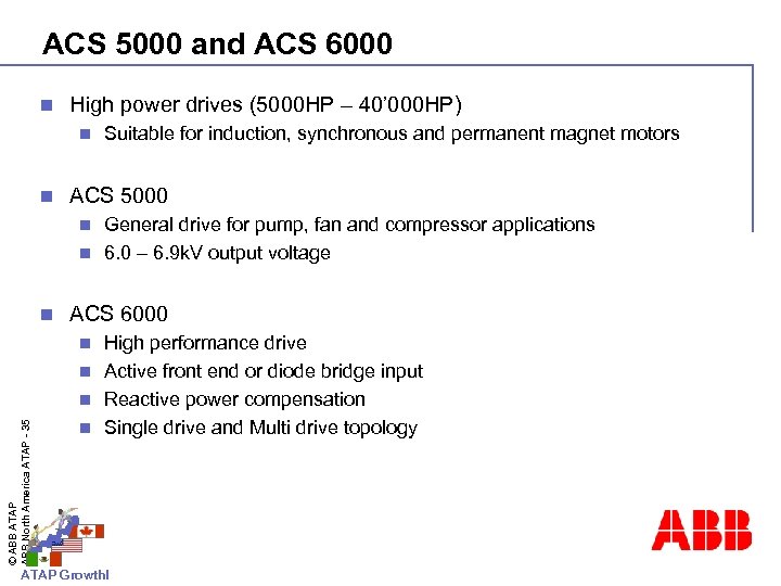 ACS 5000 and ACS 6000 n High power drives (5000 HP – 40’ 000 HP) n n Suitable for induction, synchronous and permanent magnet motors ACS 5000 General drive for pump, fan and compressor applications n 6. 0 – 6. 9 k. V output voltage n n ACS 6000 High performance drive n Active front end or diode bridge input n Reactive power compensation n Single drive and Multi drive topology © ABB ATAP ABB North America ATAP - 35 n ATAP Growth!