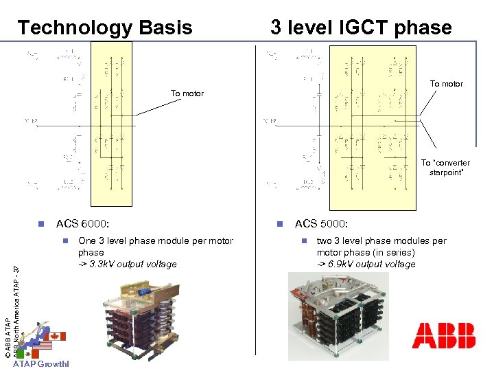 Technology Basis 3 level IGCT phase To motor To “converter starpoint” n ACS 6000: © ABB ATAP ABB North America ATAP - 37 n ATAP Growth! One 3 level phase module per motor phase -> 3. 3 k. V output voltage n ACS 5000: n two 3 level phase modules per motor phase (in series) -> 6. 9 k. V output voltage