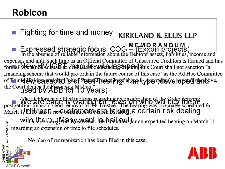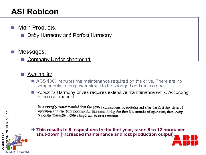 Robicon Fighting for time and money n Expressed strategic focus: COG – (Exxon projects) n New HV IGBT module with less parts n New capacitors of “self-healing” film type (developed and used by ABB for 10 years) n © ABB ATAP ABB North America ATAP - 46 n We are eagerly waiting for news on who will buy them. Until then – customers are taking a certain risk dealing with them. (Many want to bail out) ATAP Growth!