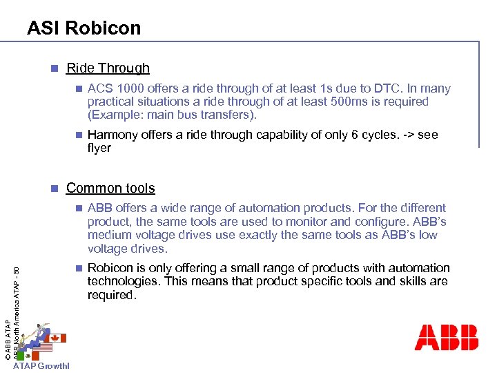 ASI Robicon n Ride Through n n n ACS 1000 offers a ride through of at least 1 s due to DTC. In many practical situations a ride through of at least 500 ms is required (Example: main bus transfers). Harmony offers a ride through capability of only 6 cycles. -> see flyer Common tools © ABB ATAP ABB North America ATAP - 50 n ATAP Growth! ABB offers a wide range of automation products. For the different product, the same tools are used to monitor and configure. ABB’s medium voltage drives use exactly the same tools as ABB’s low voltage drives. n Robicon is only offering a small range of products with automation technologies. This means that product specific tools and skills are required.