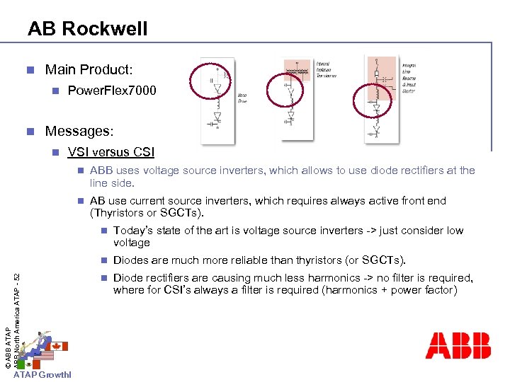 AB Rockwell n Main Product: n n Power. Flex 7000 Messages: n VSI versus CSI n ABB uses voltage source inverters, which allows to use diode rectifiers at the line side. n AB use current source inverters, which requires always active front end (Thyristors or SGCTs). ATAP Growth! Today’s state of the art is voltage source inverters -> just consider low voltage n © ABB ATAP ABB North America ATAP - 52 n Diodes are much more reliable than thyristors (or SGCTs). n Diode rectifiers are causing much less harmonics -> no filter is required, where for CSI’s always a filter is required (harmonics + power factor)