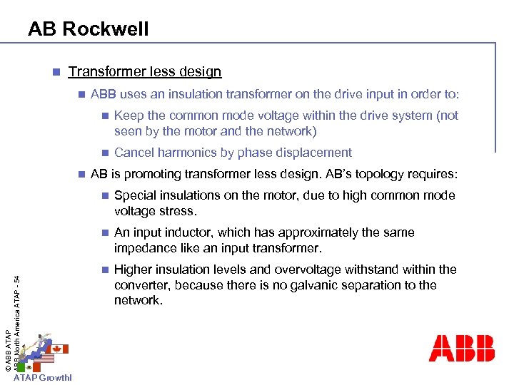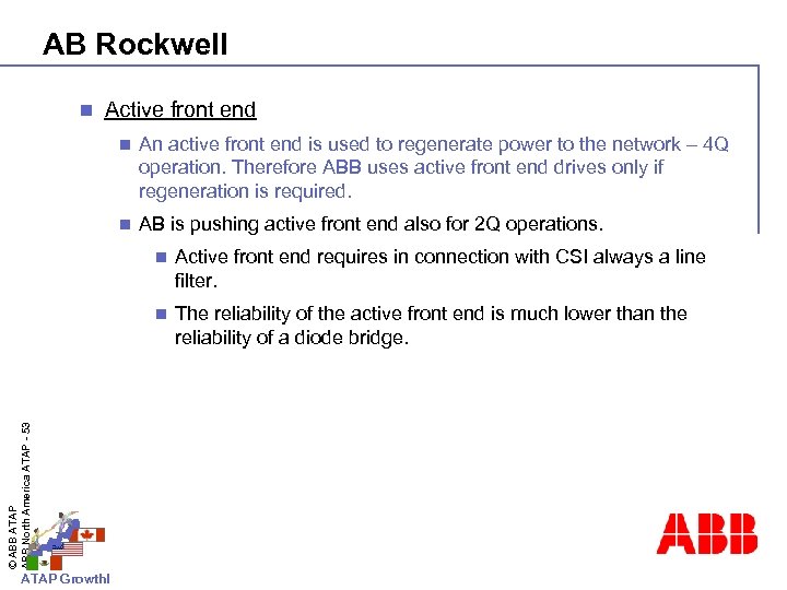 AB Rockwell n Active front end n An active front end is used to regenerate power to the network – 4 Q operation. Therefore ABB uses active front end drives only if regeneration is required. n AB is pushing active front end also for 2 Q operations. ATAP Growth! Active front end requires in connection with CSI always a line filter. n © ABB ATAP ABB North America ATAP - 53 n The reliability of the active front end is much lower than the reliability of a diode bridge.