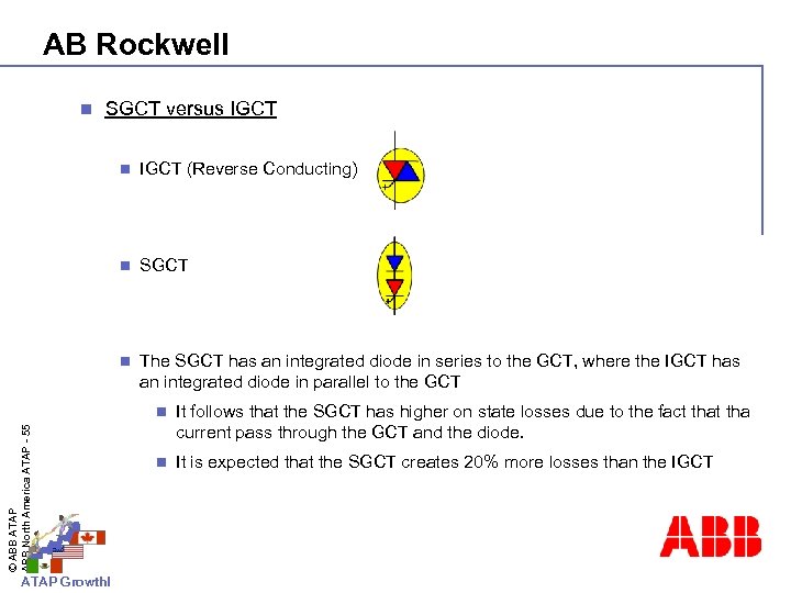 AB Rockwell n SGCT versus IGCT n IGCT (Reverse Conducting) n SGCT n The SGCT has an integrated diode in series to the GCT, where the IGCT has an integrated diode in parallel to the GCT © ABB ATAP ABB North America ATAP - 55 n ATAP Growth! It follows that the SGCT has higher on state losses due to the fact tha current pass through the GCT and the diode. n It is expected that the SGCT creates 20% more losses than the IGCT