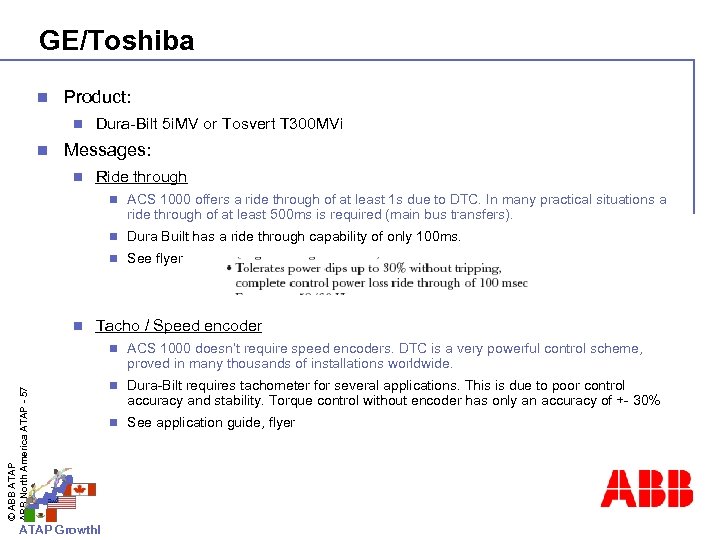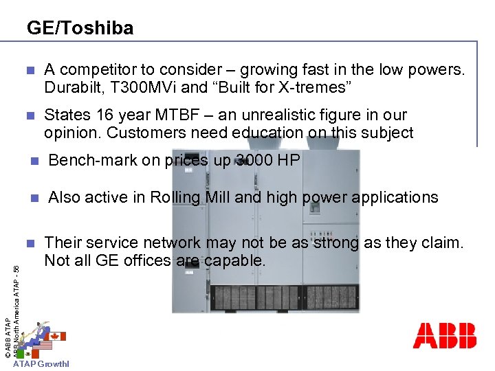 GE/Toshiba n A competitor to consider – growing fast in the low powers. Durabilt, T 300 MVi and “Built for X-tremes” n States 16 year MTBF – an unrealistic figure in our opinion. Customers need education on this subject n Bench-mark on prices up 3000 HP n Also active in Rolling Mill and high power applications © ABB ATAP ABB North America ATAP - 56 n Their service network may not be as strong as they claim. Not all GE offices are capable. ATAP Growth!