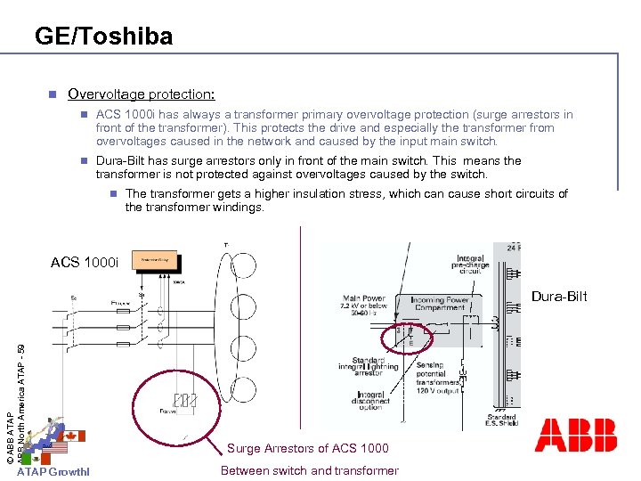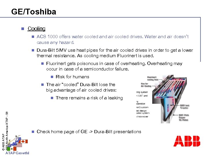 GE/Toshiba n Cooling n ACS 1000 offers water cooled and air cooled drives. Water and air doesn’t cause any hazard. n Dura-Bilt 5 i. MV use heat pipes for the air cooled drives in order to get a lower thermal resistance. As cooling medium Fluorinert is used. n Fluorinert gets poisonous in case of overheating. Overheating may occur in case of a semiconductor failure. n n The air “cooled” Dura-Bilt lose the big advantage of air cooled drives: © ABB ATAP ABB North America ATAP - 58 n ATAP Growth! n Risk for humans There remains a risk of a leaking Check home page of GE -> Dura-Bilt presentations