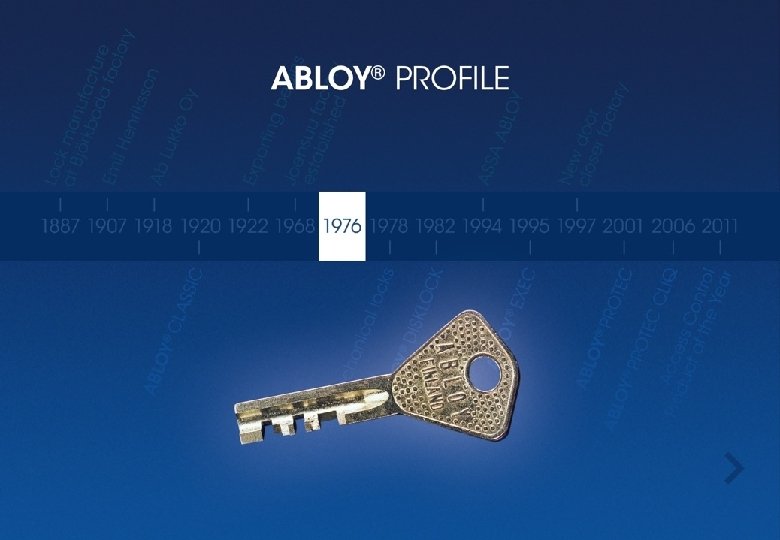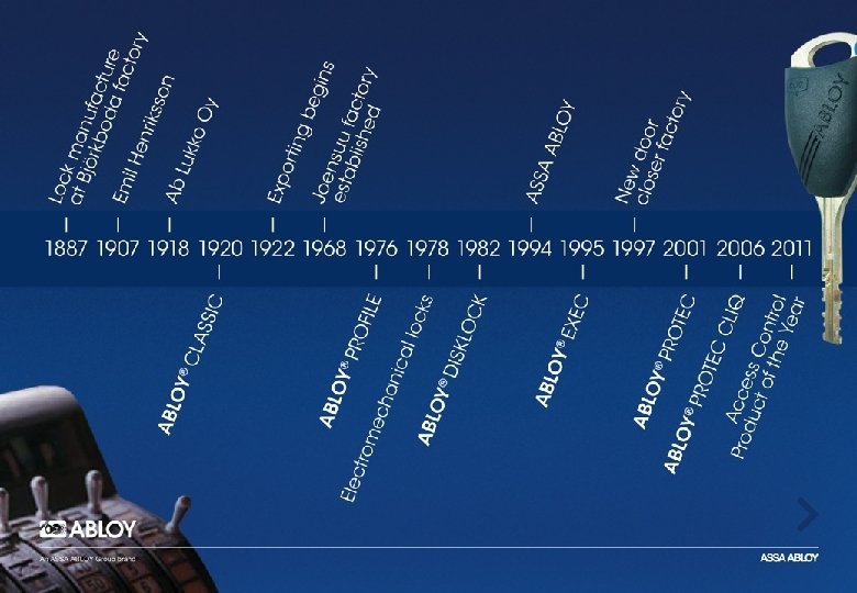 Группа компаний ASSA ABLOY Продажи 5, 4 миллиарда EUR Около 43 000 работников Торговые операции в 70 странах Представлена на Стокгольмской фондовой бирже Abloy Около 900 работников Заводы расположены в городах Йоэнсуу и Бьоркбуда