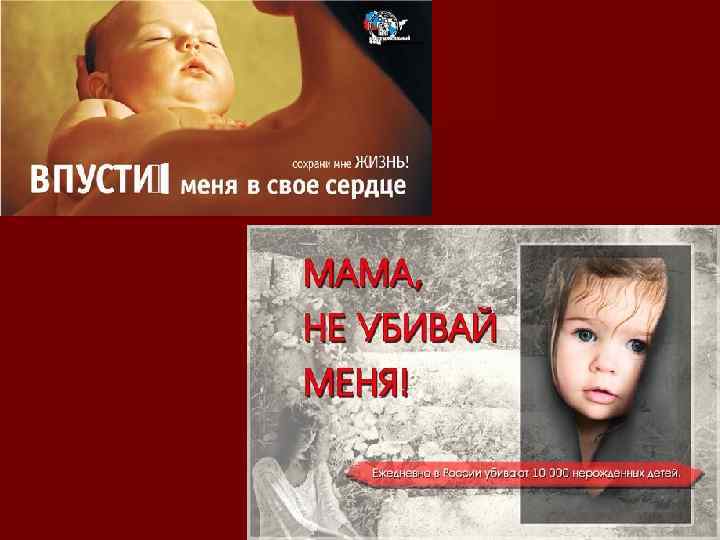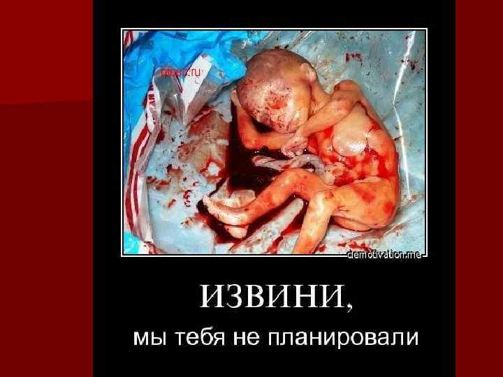 Медицинские показания к аборту В России основными показаниями для прерывания беременности являются смерть плода в утробе или угроза жизни матери, в силу её состояния или неправильного протекания беременности (например внематочная беременность). Также показаниями к аборту является неправильное внутриутробное развитие или необходимость в медицинских процедурах, пагубно влияющих на него (например, трансплантации органов). В большинстве случаев окончательное решение о применении искусственного аборта остаётся за беременной женщиной или её родственниками. n Показания к аборту в России не ограничиваются чисто медицинскими основаниями. В первом триместре беременности (до 12 недель) основным показанием к аборту является желание женщины. Во втором триместре (до 22 недель) аборт может быть проведён, если беременность наступила в результате изнасилования. n