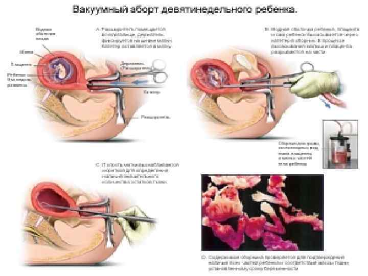 Вакуумный аборт – вакуумная аспирация с последующим выскабливанием (вид медицинского аборта) Во время этой процедуры врач открывает шейку матки металлическими расширителями или ламинариями (тонкими палками, которые вставляются часами раньше самой процедуры). Врач вводит трубку в матку и прикрепляет её к насосу. Насос размалывает тело ребёнка на части и высасывает их из матки. Такой аборт называется Расширение с последующим Выскабливанием. В этом случае врач может использовать кюретку (закругленный нож), чтобы выскоблить части тела ребёнка из матки.