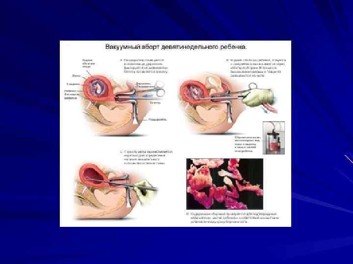 Вакуумный аборт – вакуумная аспирация с последующим выскабливанием (вид медицинского аборта) Во время этой процедуры врач открывает шейку матки металлическими расширителями или ламинариями (тонкими палками, которые вставляются часами раньше самой процедуры). Врач вводит трубку в матку и прикрепляет её к насосу. Насос размалывает тело ребёнка на части и высасывает их из матки. Такой аборт называется Расширение с последующим Выскабливанием. В этом случае врач может использовать кюретку (закругленный нож), чтобы выскоблить части тела ребёнка из матки.