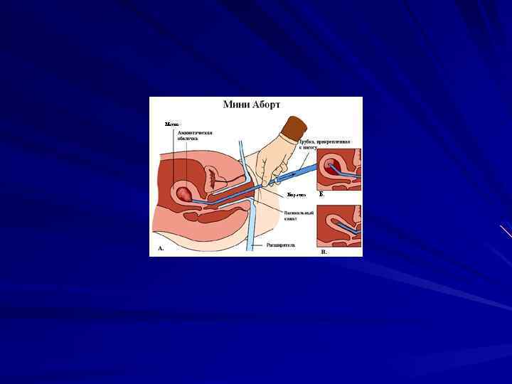 Аборт – искусственное прерывание беременности. В зависимости от срока проводят следующие способы искусственного прерывания беременности: • медикаментозный аборт (0 - 8 недель) • мини - аборт (до 5 недель) • медицинский аборт (6 - 12 недель) • солевой аборт (после 16 недель)