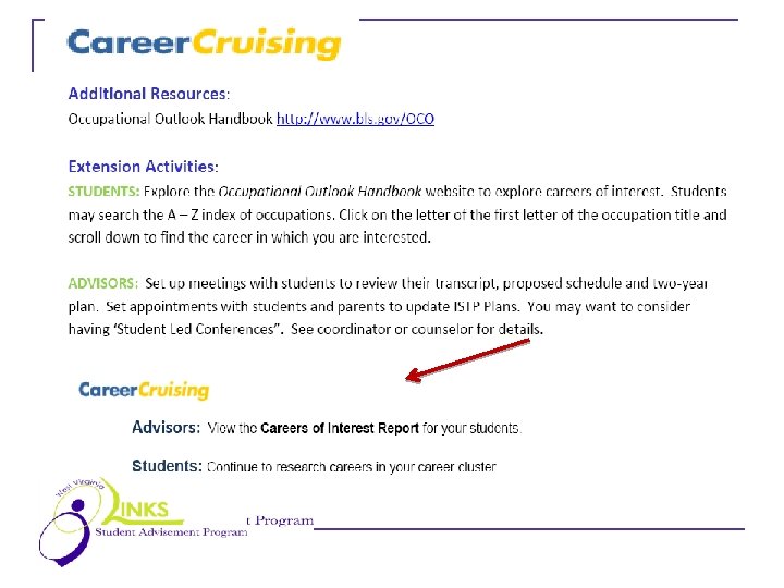 About LINKS… Piloted in 21 st Century HSTW sites 40 lesson plans per grade level (WV specific, downloadable) Standards based (Policy 2520. 19 allows schools to offer for credit) Free pilot with Career Cruising (on-line career exploration and planning tool)