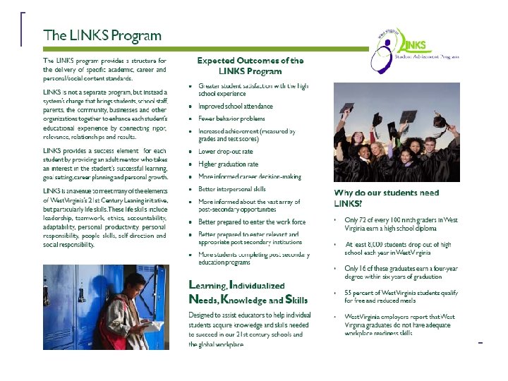 About LINKS … involving a personal relationship with at least one adult serving as an advocate for the student. bridge the gap between what is taught in the core curriculum and the skills necessary for success in school and in the work place