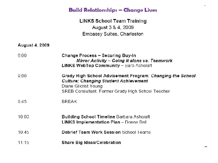 Training Objectives n Participants will… q begin developing an individual school plan for implementation n establish school timeline n consider logistics q Examine current committees and relevance to LINKS and need for expansion q understand the magnitude of the need to plan and secure buy-in q learn some strategies to secure buy-in