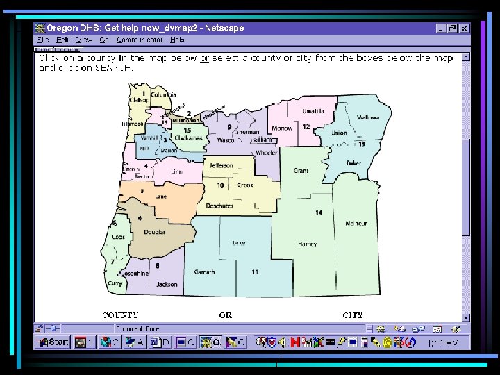 Knowing where to look! • DHS - There is DV WEB site at http: //www. dhs. state. or. us/abuse/domestic/index. htm • The site includes a map of domestic violence service providers. This map allows you to access information about shelters and domestic violence services across the state. • Domestic violence service providers are your best resources when working with survivors of domestic violence. • Legal Aid Info – WWW. Oregonlawhelp. org