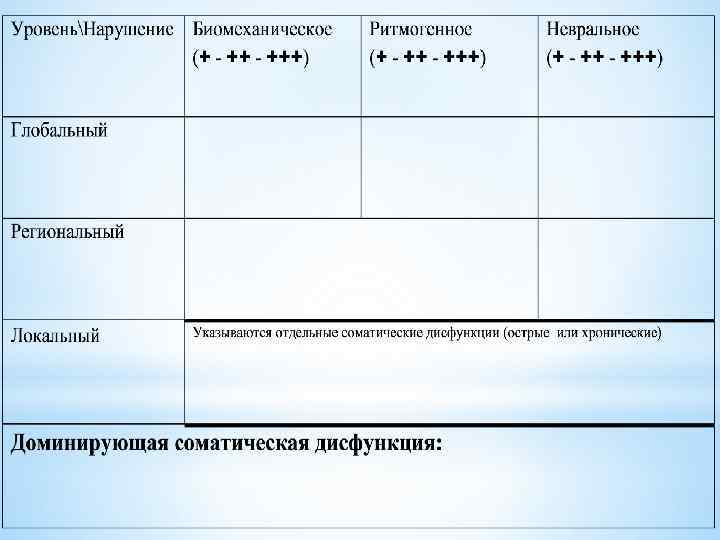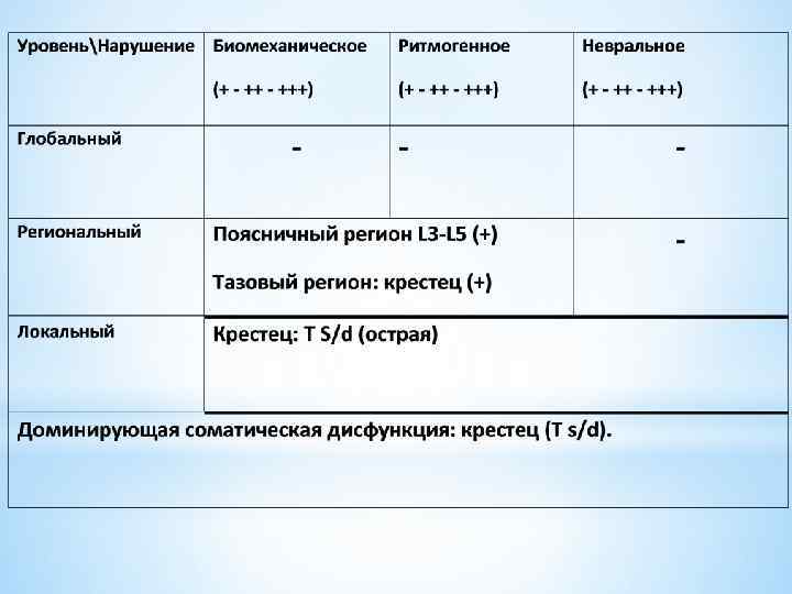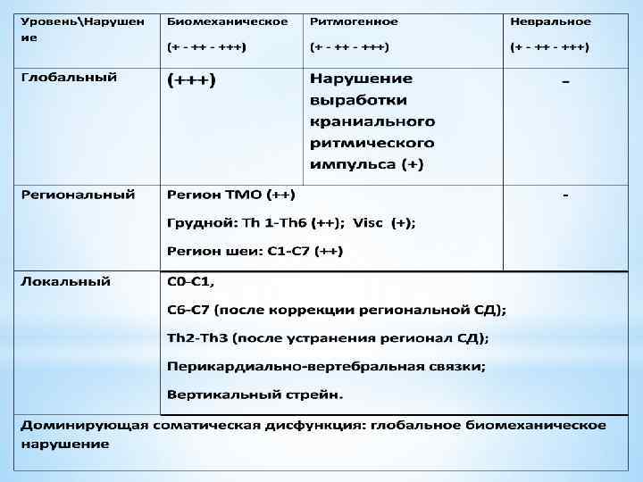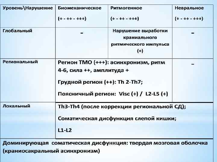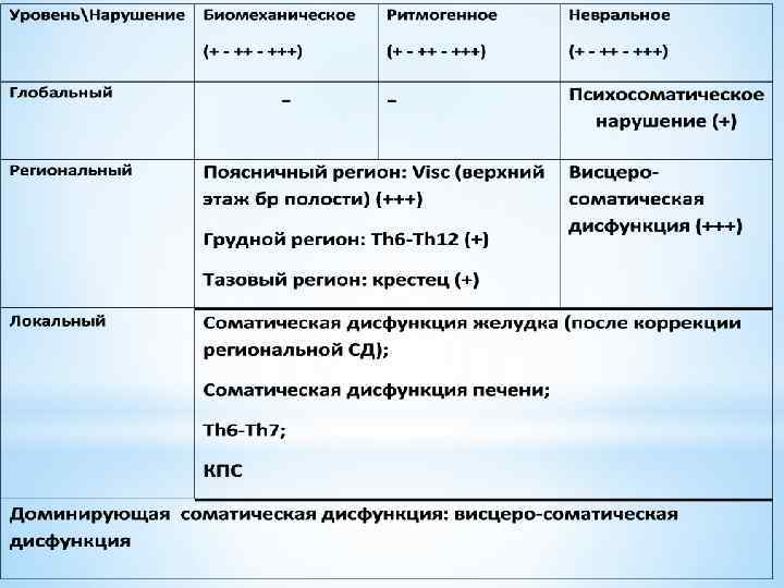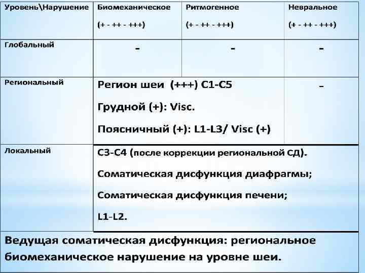 Для практики, с целью оценки выраженности биомеханических, ритмогенных и невральных нарушений на любом из уровней введены условные обозначения баллами. Один балл (+) - легкая степень выраженности нарушения; Два балла (++) – умеренная степень выраженность нарушения; Три балла (+++) – значительная степень выраженности нарушения. Хотя такой учет в известной мере является условным, однако при соответствующем опыте дает достаточно объективную количественную оценку имеющихся нарушений.