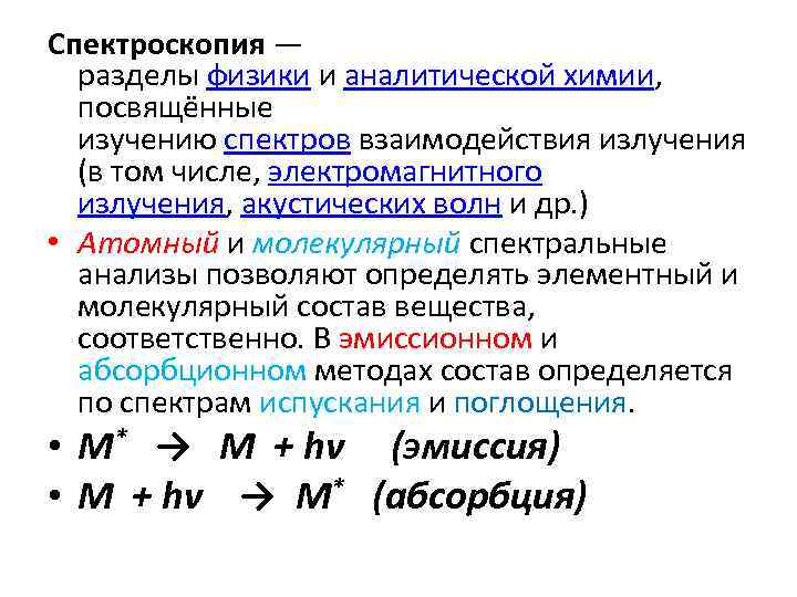 Спектроскопия — разделы физики и аналитической химии, посвящённые изучению спектров взаимодействия излучения (в том числе, электромагнитного излучения, акустических волн и др. ) • Атомный и молекулярный спектральные анализы позволяют определять элементный и молекулярный состав вещества, соответственно. В эмиссионном и абсорбционном методах состав определяется по спектрам испускания и поглощения. • M* → M + hν (эмиссия) • M + hν → M* (абсорбция)