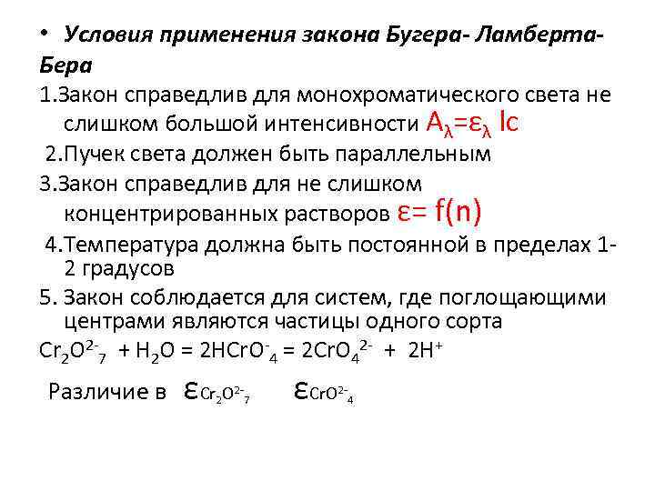 • Условия применения закона Бугера- Ламберта. Бера 1. Закон справедлив для монохроматического света не слишком большой интенсивности Аλ=ελ lc 2. Пучек света должен быть параллельным 3. Закон справедлив для не слишком концентрированных растворов ε= f(n) 4. Температура должна быть постоянной в пределах 12 градусов 5. Закон соблюдается для систем, где поглощающими центрами являются частицы одного сорта Cr 2 O 2 -7 + H 2 O = 2 HCr. O-4 = 2 Cr. O 42 - + 2 H+ Различие в εCr O 2 2 - 7 εCr. O 2 - 4