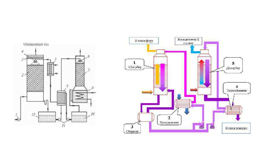 РЕГЕНЕРАЦИЯ АБСОРБЕНТА Для повторного использования поглотителя (сорбента) осуществляют его регенерацию, в процессе которой из него извлекают сорбат, реализуемый в виде сырья для других процессов или целевого товарного продукта. В случае, когда извлекаемый компонент не представляет ценности или процесс регенерации затруднен, то поглотитель (сорбент) используют всего один раз и после соответствующей обработки сливают в канализацию. 1 - вентилятор (газодувка); 2 - абсорбер; 3 - брызгоотбойник; 4, 6 - оросители; 5 - холодильник; 7 - десорбер; 8 - куб десорбера; 9 -теплообменник-рекуператор; 10, 12 - емкости для абсорбента; 11 - насосы