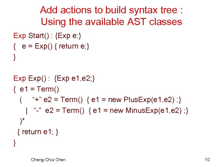 AST classes public class Interger. Literal extends Exp { pubic String f 0; public Identifier(String a 0) { f 0 = a 0 ; } public int eval() { return Integer. parse. Int(f 0); } } Cheng-Chia Chen 9