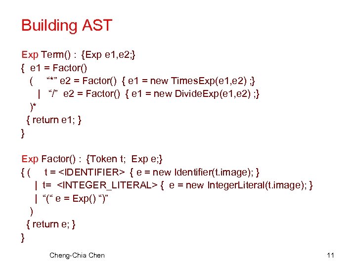 Add actions to build syntax tree : Using the available AST classes Exp Start() : {Exp e; } { e = Exp() { return e; } } Exp() : {Exp e 1, e 2; } { e 1 = Term() ( “+” e 2 = Term() { e 1 = new Plus. Exp(e 1, e 2) ; } | “-” e 2 = Term() { e 1 = new Minus. Exp(e 1, e 2) ; } )* { return e 1; } } Cheng-Chia Chen 10
