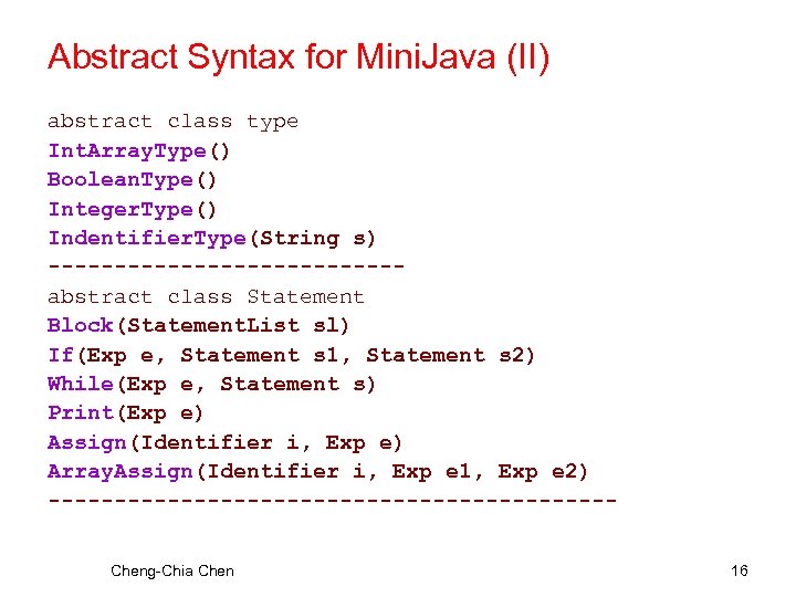 Abstract Syntax for Mini. Java (I) Package syntaxtree; Program(Main. Class m, Class. Dec. List c 1) Main. Class(Identifier i 1, Identifier i 2, Statement s) --------------abstract class Class. Decl. Simple(Identifier i, Var. Decl. List vl, method. Decl. List m 1) Class. Decl. Extends(Identifier i, Identifier j, Var. Dec. List vl, Method. Decl. List ml) --------------Var. Decl(Type t, Identifier i) Method. Decl(Type t, Identifier I, Formal. List fl, Variable. Decl. List vl, Statement. List sl, Exp e) Formal(Type t, Identifier i) Cheng-Chia Chen 15