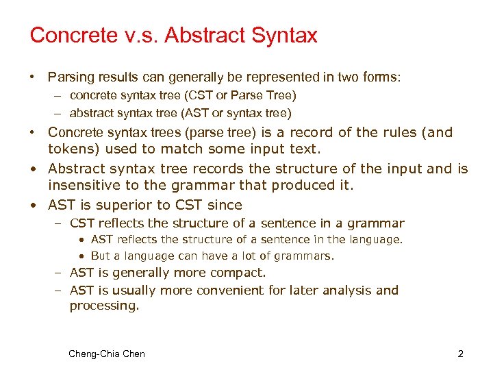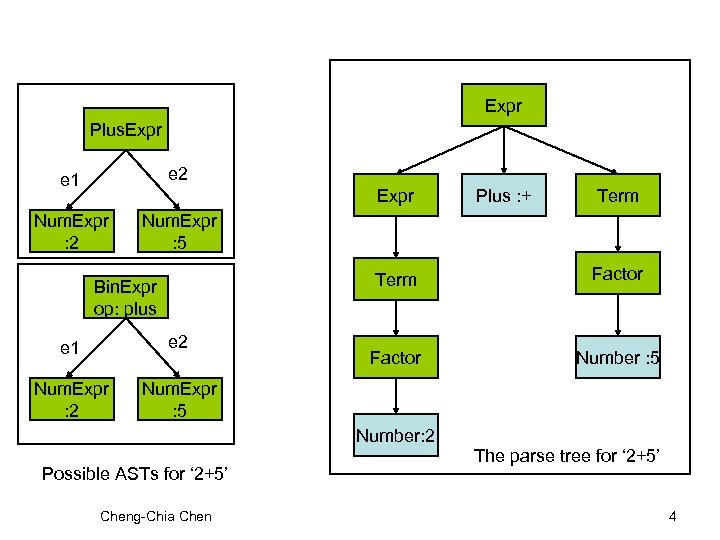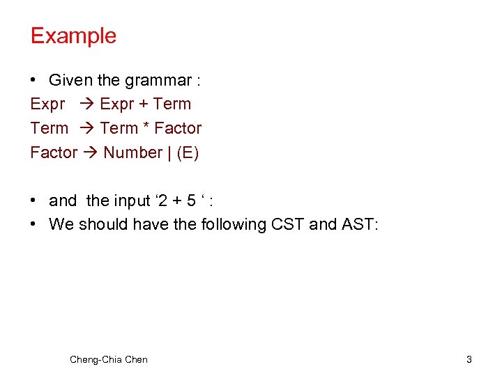 Example • Given the grammar : Expr + Term * Factor Number | (E) • and the input ‘ 2 + 5 ‘ : • We should have the following CST and AST: Cheng-Chia Chen 3
