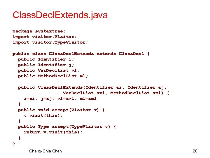 Class. Decl. java package syntaxtree; import visitor. Visitor; import visitor. Type. Visitor; public abstract class Class. Decl { public abstract void accept(Visitor v); public abstract Type accept(Type. Visitor v); } Cheng-Chia Chen 19