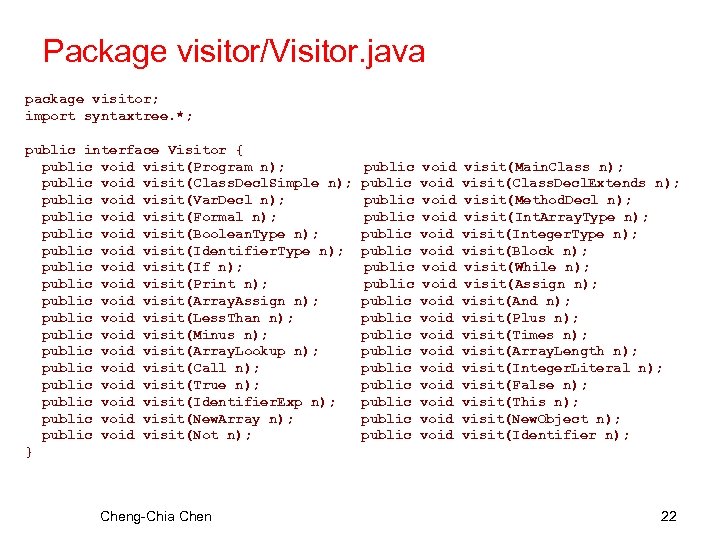Package visitor/Visitor. java package visitor; import syntaxtree. *; public interface Visitor { public void visit(Program n); public void visit(Class. Decl. Simple n); public void visit(Var. Decl n); public void visit(Formal n); public void visit(Boolean. Type n); public void visit(Identifier. Type n); public void visit(If n); public void visit(Print n); public void visit(Array. Assign n); public void visit(Less. Than n); public void visit(Minus n); public void visit(Array. Lookup n); public void visit(Call n); public void visit(True n); public void visit(Identifier. Exp n); public void visit(New. Array n); public void visit(Not n); } Cheng-Chia Chen public public public public public void void void void void visit(Main. Class n); visit(Class. Decl. Extends n); visit(Method. Decl n); visit(Int. Array. Type n); visit(Integer. Type n); visit(Block n); visit(While n); visit(Assign n); visit(And n); visit(Plus n); visit(Times n); visit(Array. Length n); visit(Integer. Literal n); visit(False n); visit(This n); visit(New. Object n); visit(Identifier n); 22