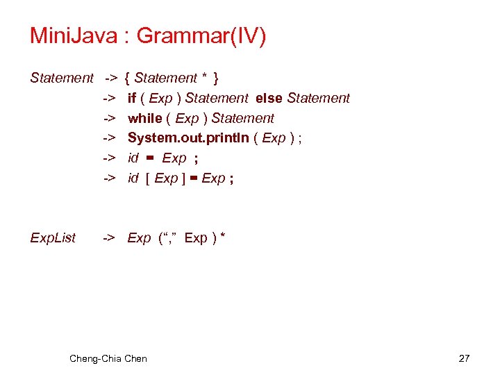 Mini. Java : Grammar(IV) Statement -> { Statement * } -> if ( Exp ) Statement else Statement -> while ( Exp ) Statement -> System. out. println ( Exp ) ; -> id = Exp ; -> id [ Exp ] = Exp ; Exp. List -> Exp (“, ” Exp ) * Cheng-Chia Chen 27